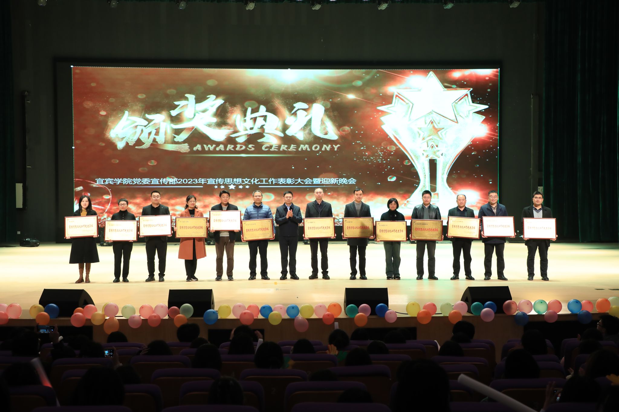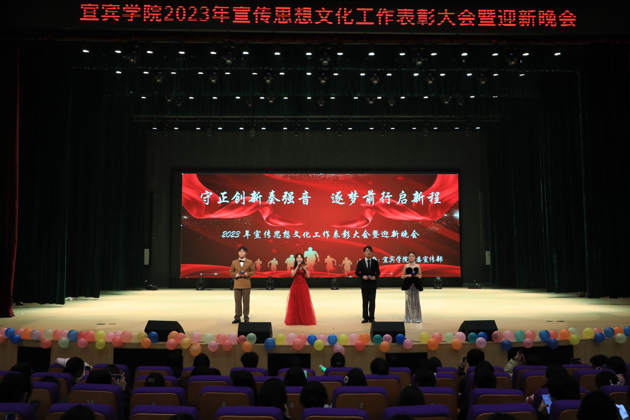 12月14日晚,由宜宾学院党委宣传部主办的以“守正创新奏强音,逐梦前行启新程”为主题的宣传思想文化工作表彰大会暨迎新晚会在学校临港校区二期开放会堂举行。学校党委副书记蒋道平出席,受表彰的职能部门、二级学部(院)负责人及优秀特约宣传委员,党委宣传部全体人员,党委宣传部抖音工作部、官方微信微博、校报记者团、校园电视台以及VOC广播电台的学生记者近400人参加晚会。