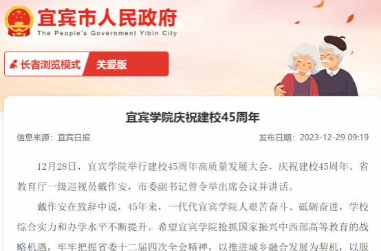 近日,宜宾学院举办建校45周年系列活动,全面展示学校四十五年来的办学治校经验和改革发展成就,受到了学习强国、中国教育在线、四川观察、四川新闻网等中央、省市各大主流媒体及社会各界的广泛关注。在建校45周年系列活动举办期间,各大新闻媒体聚焦宜宾学院,对学校高质量服务宜宾城乡融合发展情况,学校举办45周年办学成果展、召开高质量发展大会、重磅发布专题宣传片《笃行致远 赓续辉煌》、举办建校45周年文艺晚会等进行报道。