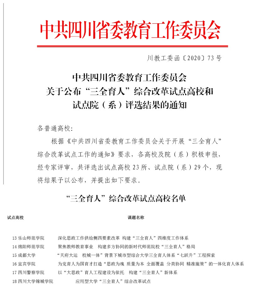 为全面贯彻落实习近平新时代中国特色社会主义思想、党的十九大和十九届四中全会精神,推动全国高校思想政治工作会议和《中共中央国务院关于加强和改进新形势下高校思想政治工作的意见》精神落地生根,全面实施《高校思想政治工作质量提升工程实施纲要》,大力提升思想政治工作质量。学校紧紧抓住“立德树人”根本任务,充分发挥课程、科研、实践、文化、网络、心理、管理、服务、资助、组织等方面工作的育人功能,把思想政治工作贯穿教育教学全过程。根据《中共四川省委教育工作委员会关于开展“三全育人”综合改革试点工作的通知》要求,学校党委高度重视,由党委宣传部负责组织开展并于今年9月完成试点高校的申请工作。根据《中共四川省委教育工作委员会关于公布“三全育人”综合改革试点高校和试点院(系)评选结果的通知》,我校申报的试点高校课题获得正式通过。