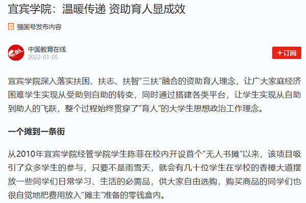 1月5日,我校“三全”育人之资助育人典型事迹——《宜宾学院:温暖传递资助育人显成效》被学习强国、今日头条、中国教育在线等多家主流媒体报道。