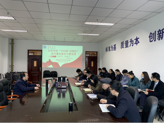 12月31日,宜宾学院党委常委、党委宣传部长李成文在硕勋楼1007会议室以《守纪律讲规矩》为题,为质量管理与检验检测学部讲授党风廉政建设专题党课。