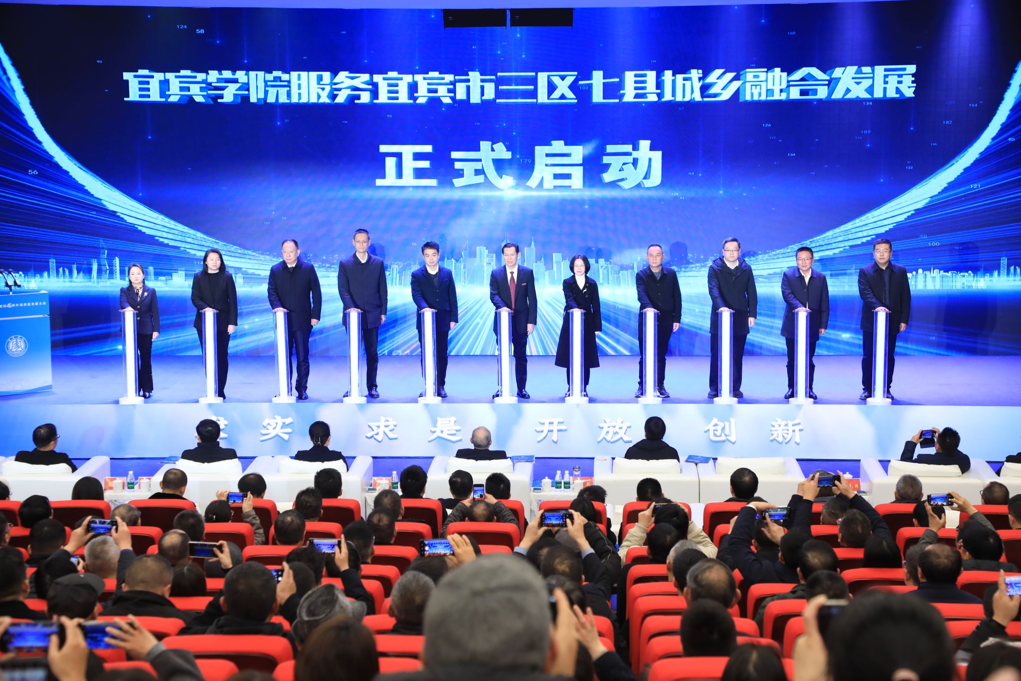 庹先国在会上致辞、何诣然宣读贺信;宜宾学院教师代表彭贵川、校友代表周跃立、学生代表刘颖在会上发言;会议还举行产教融合实训基地展演、宜宾学院服务宜宾市三区七县城乡融合发展启动仪式。会后,与会领导、嘉宾还参观了宜宾学院建校45周年办学成果展。