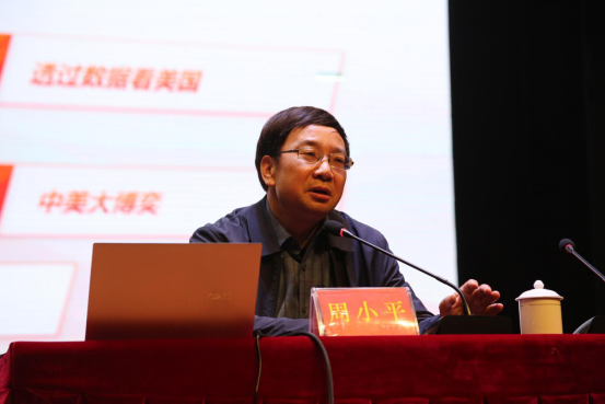 周小平从习近平总书记关于“当今世界正面临百年未有之大变局”的重要论断出发,结合国际国内形势,透过数据审视美国经济社会发展减退,彰显中国经济社会发展大势。报告内容丰富,讲解深入浅出,数据详实、案例丰富,让我们感悟到世界正面临百年未有之大变局,让我们坚信中国必然崛起且正在崛起。他指出,我们国家只用了短短几十年的时间,靠着敢教日月换新天的苦干实干,实现了发展上的腾飞,拥有了更加理性客观看待世界的视角。特别是面对突如其来的新冠肺炎疫情,大家勠力同心、共克时艰,充分彰显了中国愈发坚定的道路自信、理论自信、制度自信和文化自信。他强调,只有把党史学好、总结好,把党的成功经验传承好、发扬好,才能始终保持平视这个世界的大无畏奋斗精神,鼓舞起我们这一代挺进新长征、奋进新时代的精气神。