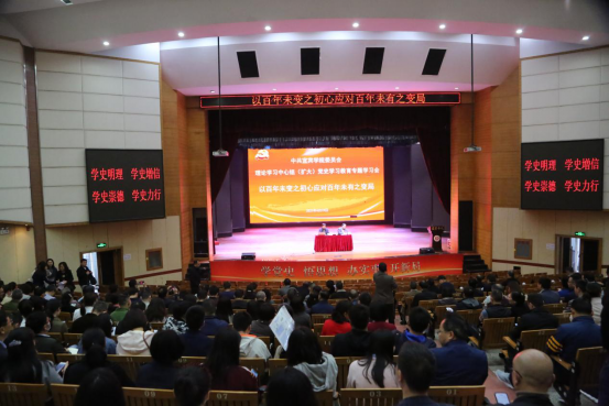 4月19日上午9:00,宜宾学院在博雅楼演播厅召开党委理论学习中心组(扩大)党史学习教育暨领导干部读书班专题学习会,会议特邀长宁县政协党组书记、政协主席周小平同志作题为《以百年未变之初心 应对百年未有之变局》的专题讲座。学校党委常委、全校处科级干部、马克思主义学院教师代表、专职辅导员代表参加学习会,会议由党委副书记鲁飞主持。