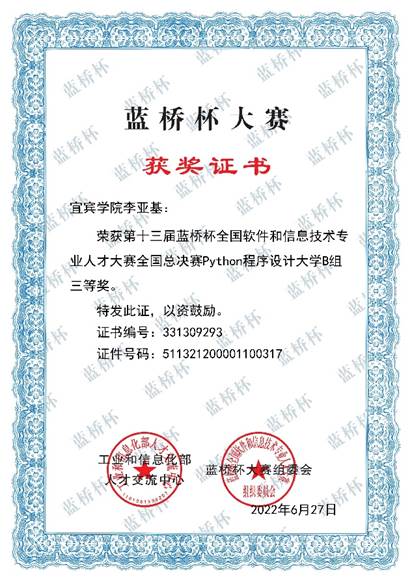 日前,第十三届“蓝桥杯”全国软件和信息技术人才大赛迎来全国总决赛结果揭晓,人工智能与大数据学部罗晟荣获“Java软件开发大学B组三等奖”,李亚基荣获“Python程序设计大学B组三等奖”,杨凡荣获“C/C++程序设计大学B组优秀奖”,宜宾学院荣获“第十三届蓝桥杯全国软件和信息技术专业人才大赛全国总决赛软件类优胜学校及优秀组织单位奖”。