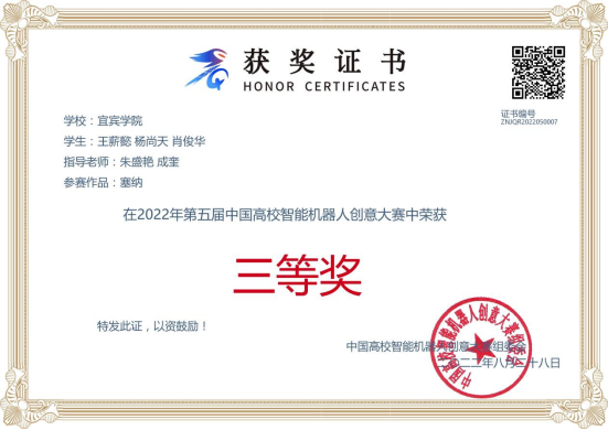 宜宾学院“K.K”“宜宾长江”和”陌芸”三支参赛队伍首先参加了竞争激烈的四川省选拔赛,由王薪懿,肖俊华,杨尚天组成的“宜宾长江”队在本次比赛中获得中国高校智能机器人创意大赛四川省选拔赛第一名(一等奖),并获得参加国赛资格。经过几天的战术调整、方案优化和奋勇拼搏,最终“宜宾长江”队在全国总决赛中获得三等奖。另外两支队伍分别获得了四川省选拔赛三等奖。