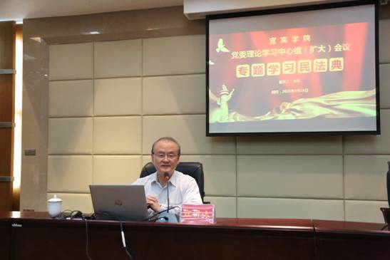 为深入贯彻落实习近平总书记关于广泛开展民法典普法工作的重要指示,切实加强民法典的学习宣传贯彻,9月29日上午9:00,宜宾学院在图书馆三会议室召开党委理论学习中心组(扩大)学习会议,四川大学李平教授作专题辅导报告。党委常委、副处级及以上干部,马克思主义学院、法学与公共管理学部法学院教师代表,专职辅导员参加学习。学习会由党委副书记鲁飞主持。