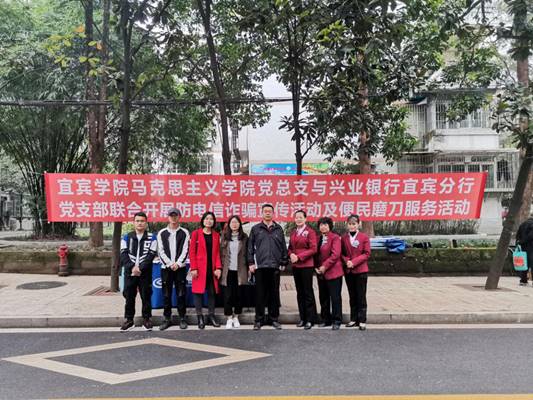 为防范电信诈骗、网络安全风险,增强师生员工反洗钱、人民币反假知识,提高师生员工安全意识。10月30日上午9:00—12:30,马克思主义学院党总支与兴业银行宜宾分行党支部在宜宾学院A区教职工宿舍区联合开展了防电信诈骗等宣传和免费便民磨刀服务活动。马克思主义学院党总支书记刘首昌、思想政治教育专业学生党支部支委成员、兴业银行宜宾分行党支部党员及相关人员、学生服务志愿者共10余人参加了此次活动。