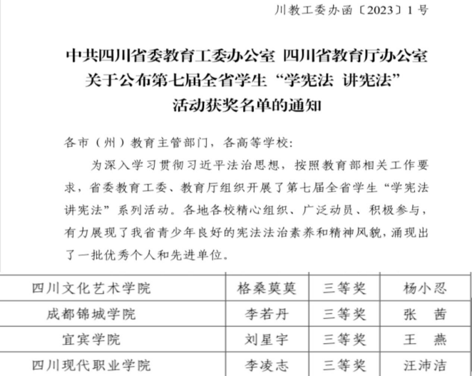 10月22日,为保证刘星宇同学以饱满的状态参与比赛,指导老师王燕提前为其提供现场指导和设备支持。10月23日,四川省第七届“学宪法,讲宪法”总决赛正式开始。此次总决赛分为初赛和决赛两场比赛,比赛过程中,刘星宇同学激昂高亢,用真情歌颂国家宪法,抒发自己对宪法的炽热情怀,表达了学习宪法精神,奋进新征程、建功新时代的坚定信念,充分表达了对宪法的热爱和赞扬。