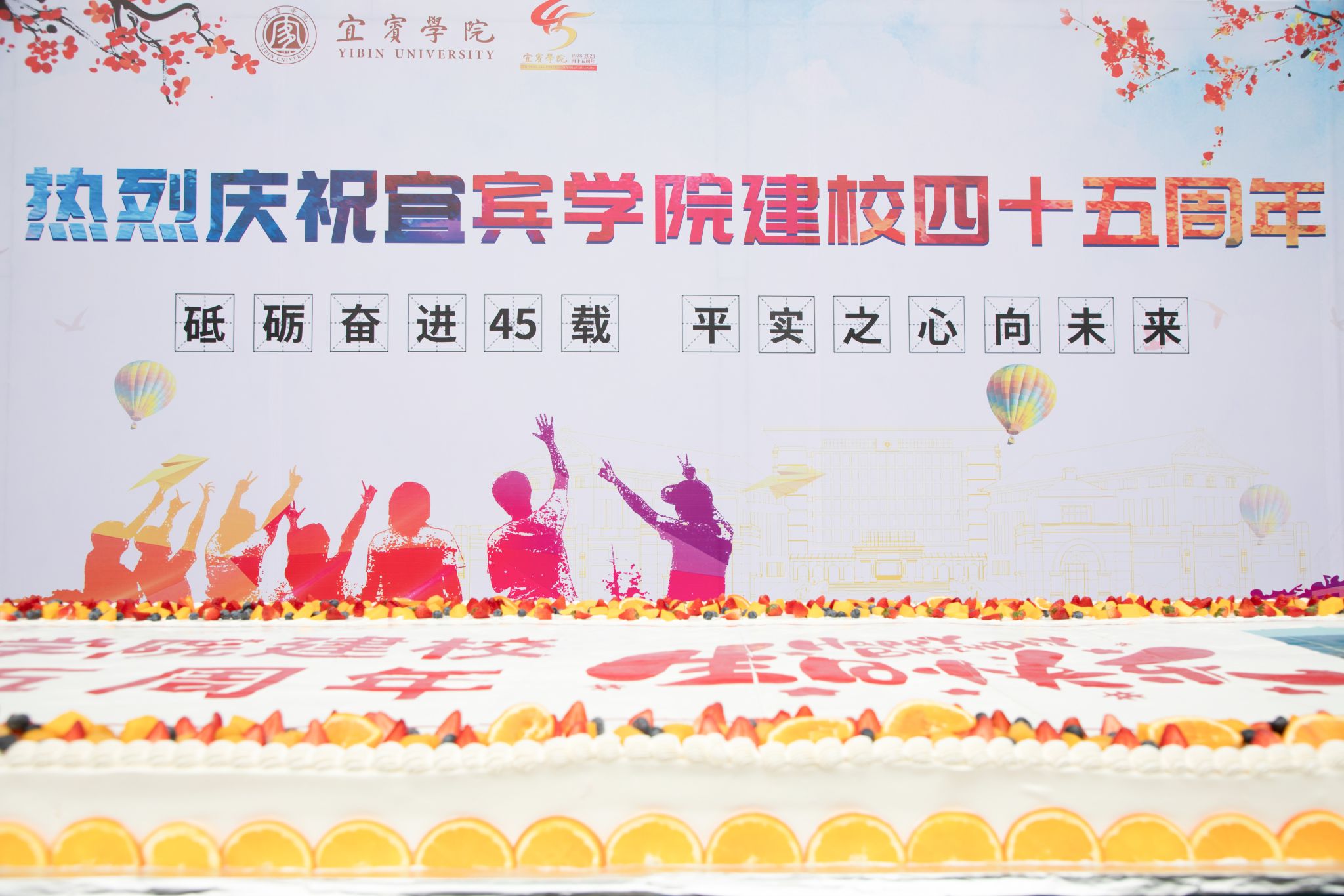 四十五周年校庆蛋糕平面设计规格为4.5*1.1米,现场制作近5小时完成。蛋糕中心写着“宜宾学院建校四十五周年生日快乐”,左右分别搭配着宜宾学院校徽和临港校区正门俯瞰图,表达对学校未来的美好愿景,四周簇拥着新鲜美味的水果,象征着宜宾学院人紧密团结在一起,共赴美好未来。蛋糕选择4.5米的长度,代表着宜宾学院45年的岁月沉淀,象征着一路走来的光辉岁月。