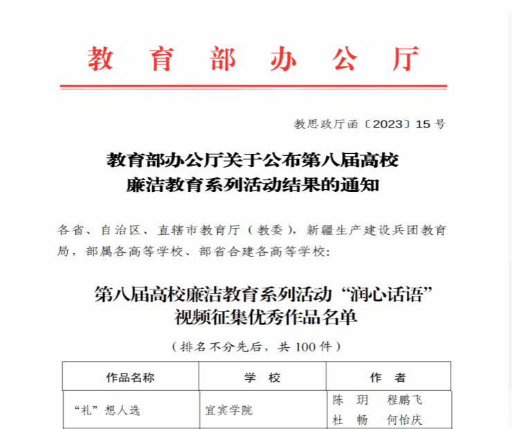近日,教育部办公厅公布了第八届高校廉洁教育系列活动有关评选结果,我校选送的微电影《“礼”想人选》荣获“润心话语”视频征集环节全国优秀作品荣誉称号,经济与工商管理学部2020级14班胡昊元同学荣获廉洁教育知识问答环节全国优秀学员。