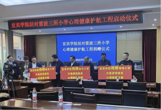 启动仪式结束后,宜宾学院组织了捐赠仪式,向雷波县城关小学、海湾小学、金沙小学捐赠全套沙盘设备和心理健康教育书籍,刘立云、李大鹏等共同见证“擎灯工程”的暖心行动。