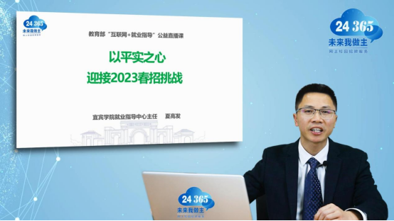 为深入贯彻落实习近平总书记来校视察重要指示精神,做实做细就业指导服务,抓住春招机会落实就业,2月19日,宜宾学院学生处就业指导中心主任夏高发受邀在教育部全国大学生学业与职业发展平台作主题为“以平实之心迎接2023春招挑战”的公益直播课,分享春招攻略,助力大学生顺利就业。