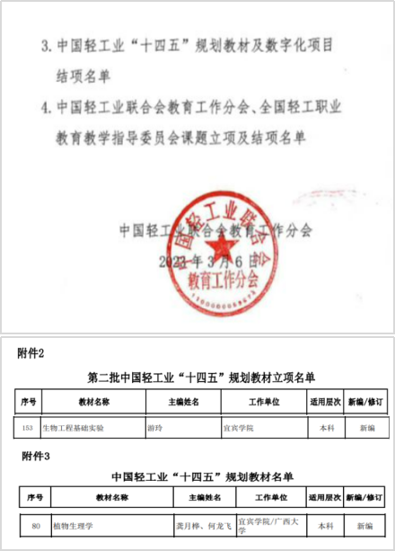 近日,根据《关于2022年度中国轻工业教材、数字化、课题等项目评审结果的公示》,中国轻工业联合会公布了“十四五”规划教材项目立项名单。经单位申报、专家评审,宜宾学院农林与食品工程学部教授龚月桦及其教学团队编写的理论课教材《植物生理学》和教授游玲及其教学团队编写的实验课教材《生物工程基础实验》,均入选中国轻工业“十四五”规划立项教材,并于2023年陆续出版。